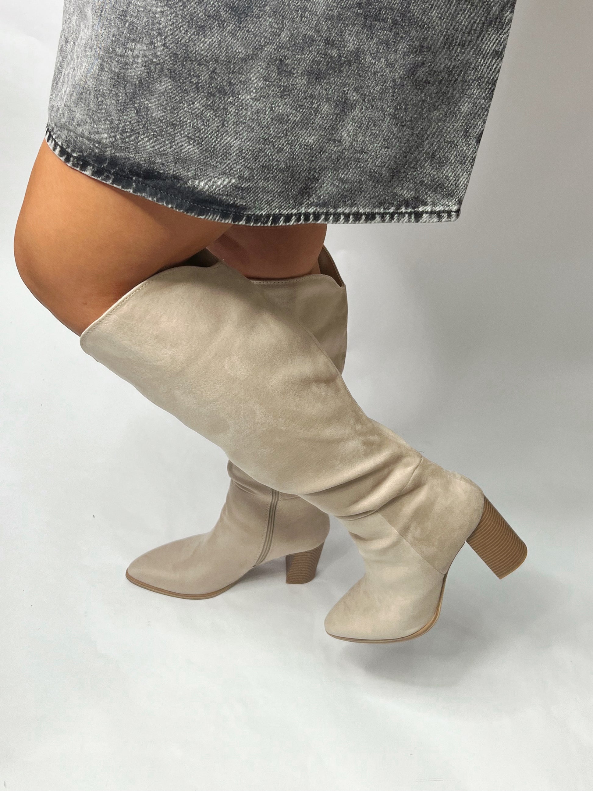 Faux suede knee high boots, featuring stacked block heel, zip closure, fabric lining and pointed almond toe.