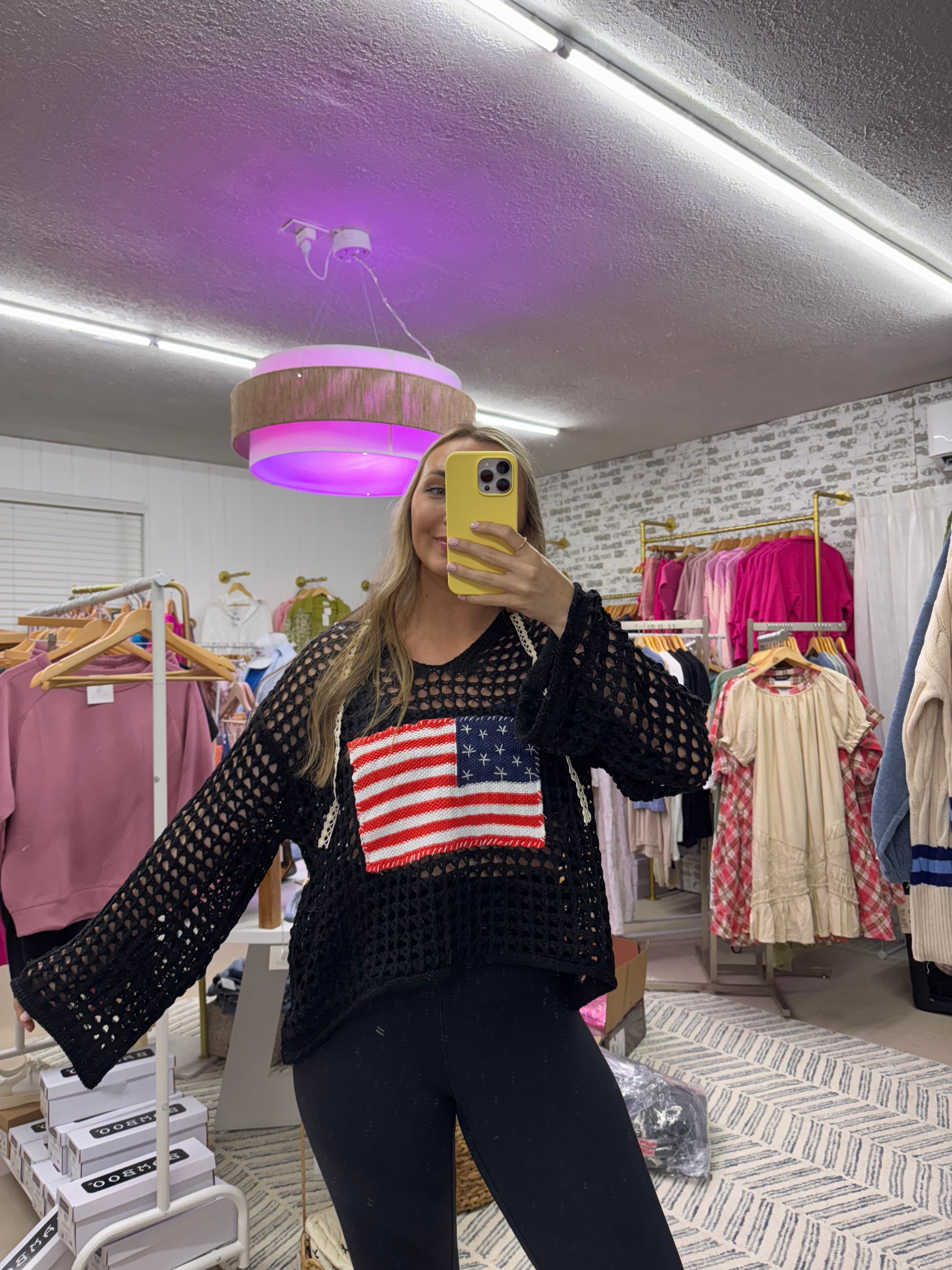 Oversized black crochet / knit long sleeve top with thin hood and an American Flag Patch.