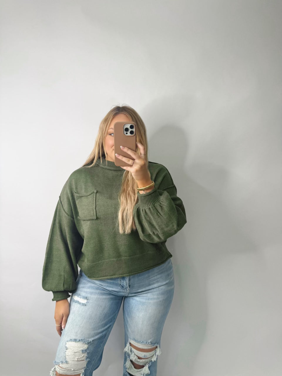 Perfect fall sweater - featuring rounded neckline, front pocket, and balloon sleeves. Relaxed fit.