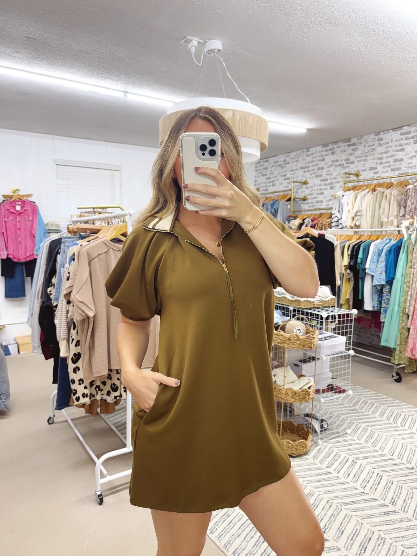 Effortlessly casual meets classy comfort. This olive-green collared dress features a soft, relaxed fit with a half-zip neckline and contrasting ivory collar that adds a hint of vintage charm. The flutter-style short sleeves and hidden side pockets make it as functional as it is flattering. 55% rayon 40% polyester 5% spandex. Fit is true to size