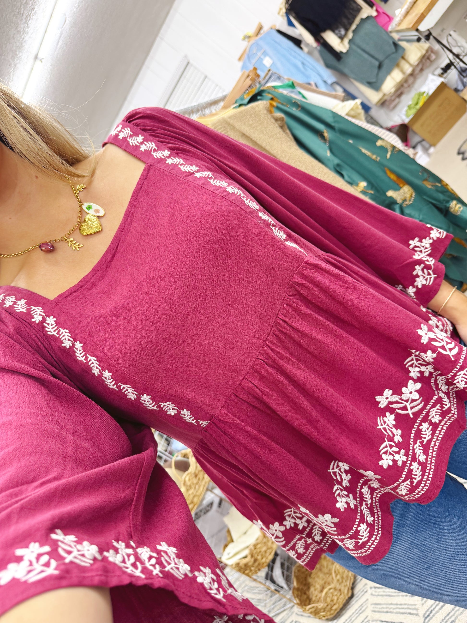 Bring feminine flair to your everyday style with this embroidered berry peplum top. Featuring a square neckline, flowy bell sleeves, and delicate white floral embroidery, it’s the perfect blend of charm and comfort. The peplum silhouette adds a flattering shape, while the lightweight rayon crepe fabric makes it easy to wear from day to night. Loose fit