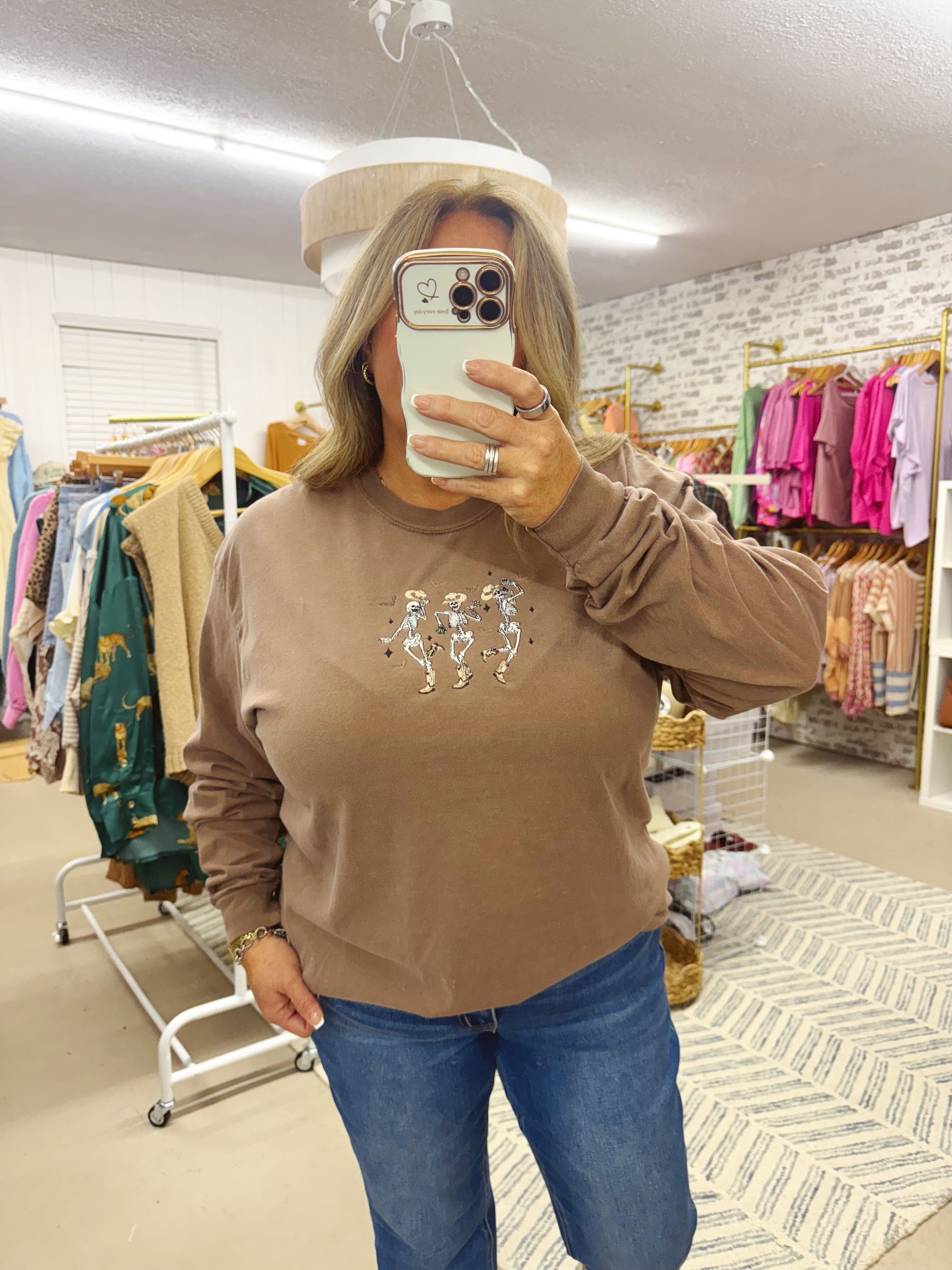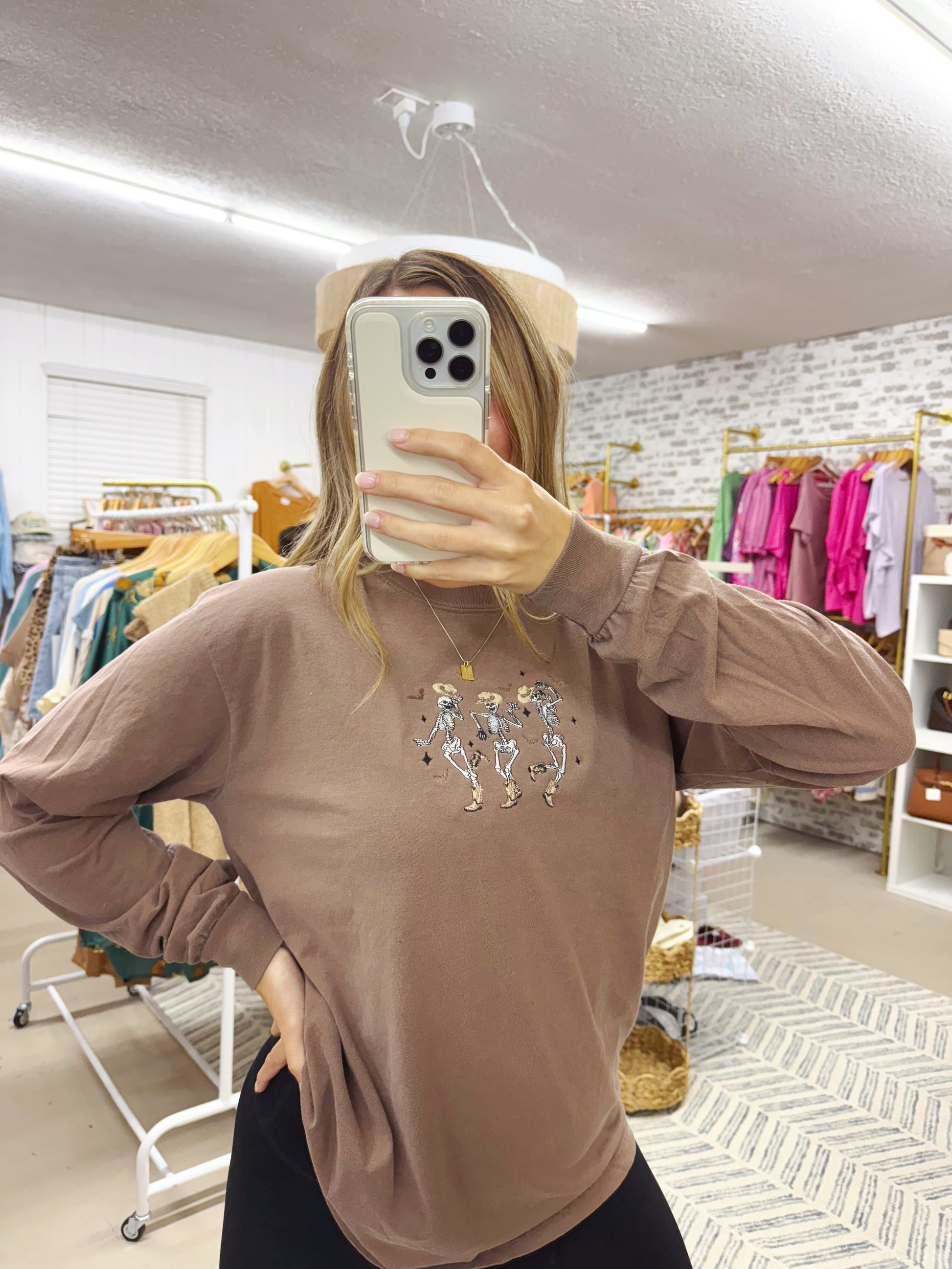 Playful cowgirl graphic long-sleeve tee with embroidered dancing skeletons. Fit is true to size.