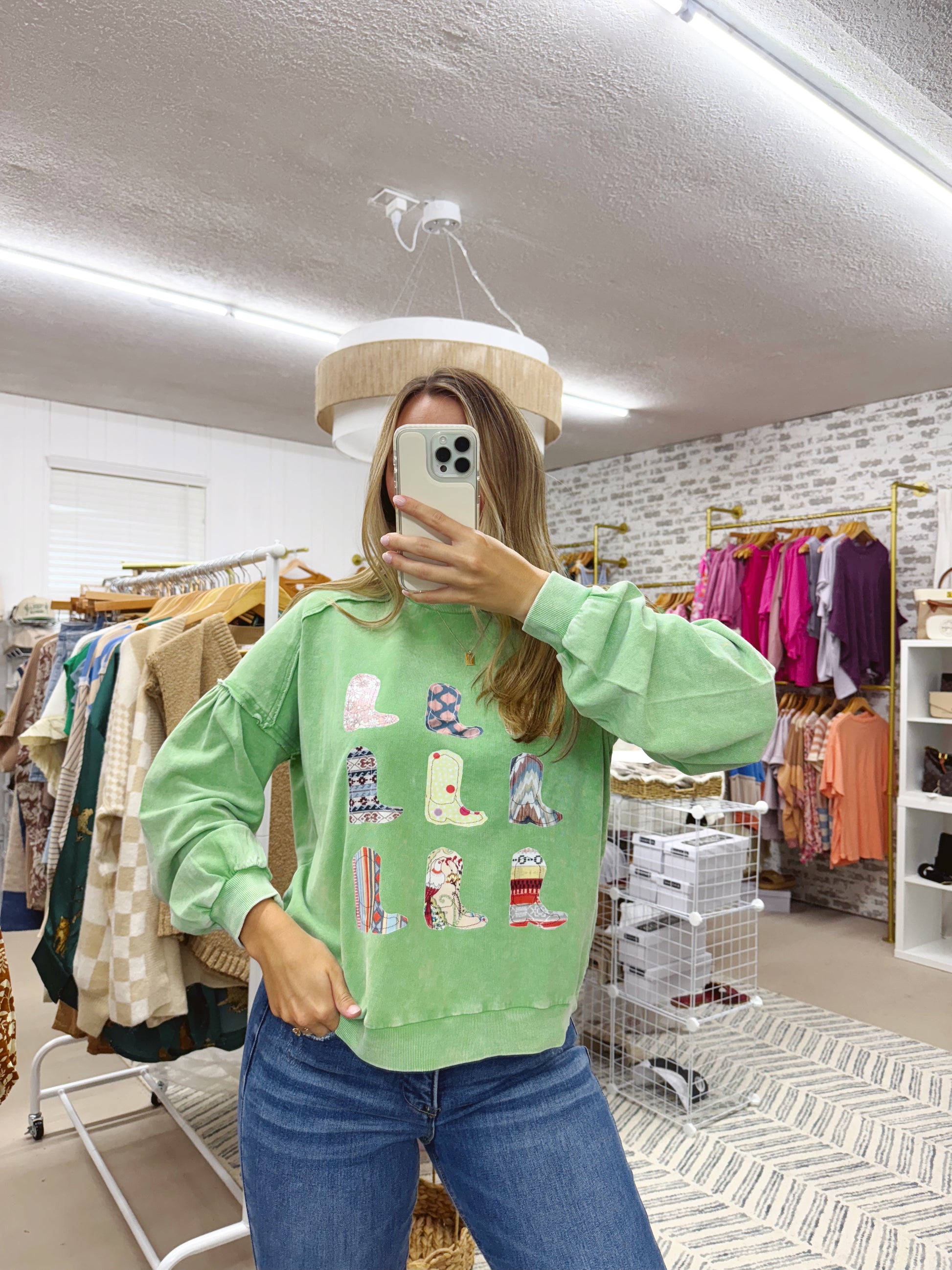 Bring a playful western touch to your wardrobe with this sage green graphic sweatshirt. Featuring colorful cowboy boot designs across the front, this cozy pullover has a relaxed fit, soft fabric, and ribbed trim for all-day comfort. Perfect for layering with denim and boots for a fun casual look.