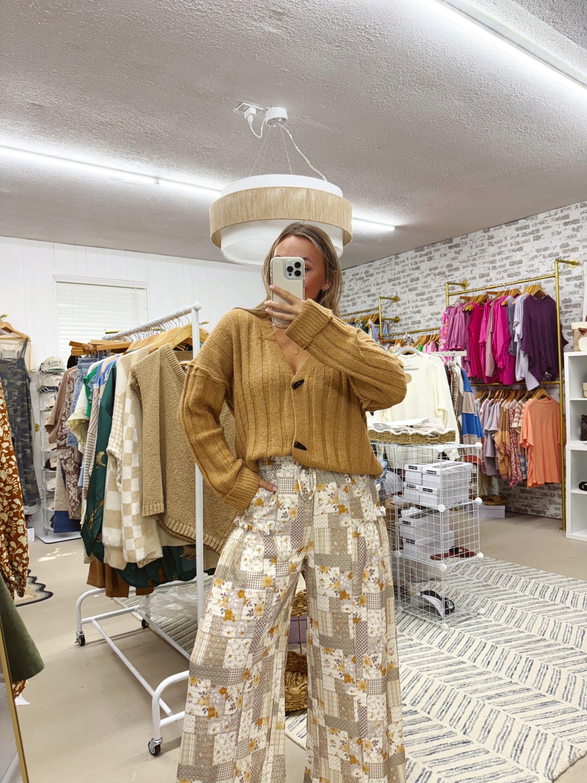 Boho-inspired and effortlessly chic, these wide-leg patchwork pants with pockets feature a soft flowy fit and earthy neutral tones with subtle floral details. Designed for all-day comfort with an elastic waist and drawstring, they pair beautifully with cozy knits or simple tops, making them a versatile statement piece for any season.
