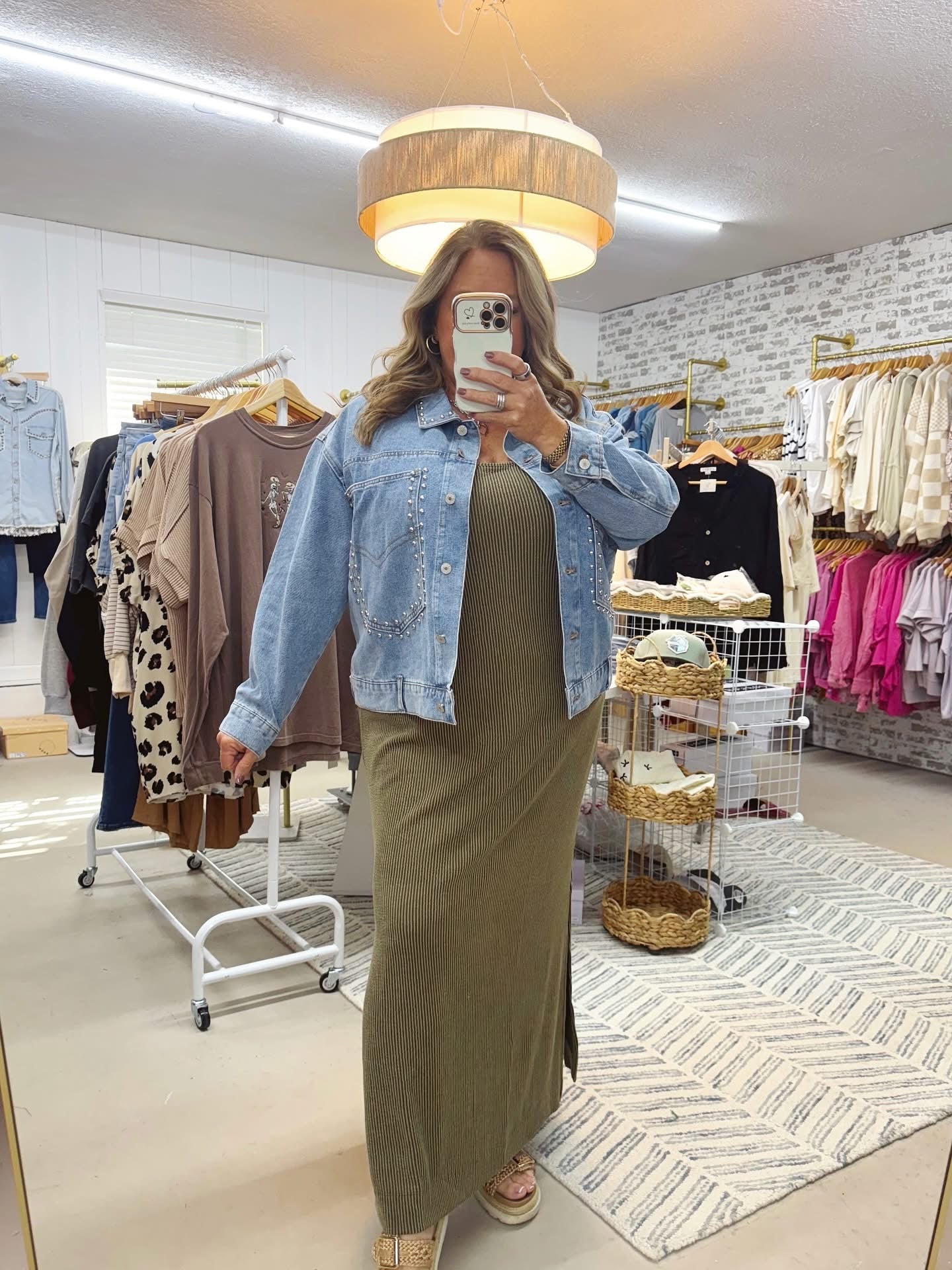 A classic layer with a little edge! This light-wash denim jacket features silver stud detailing along the front pockets and seams, adding the perfect amount of sparkle to your everyday style. Designed with a relaxed fit and timeless button front. Relaxed fit!