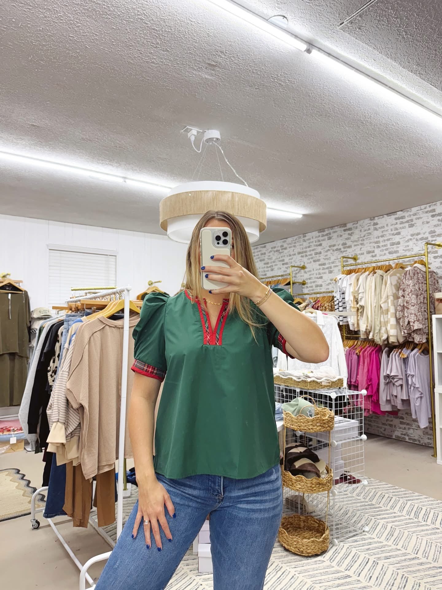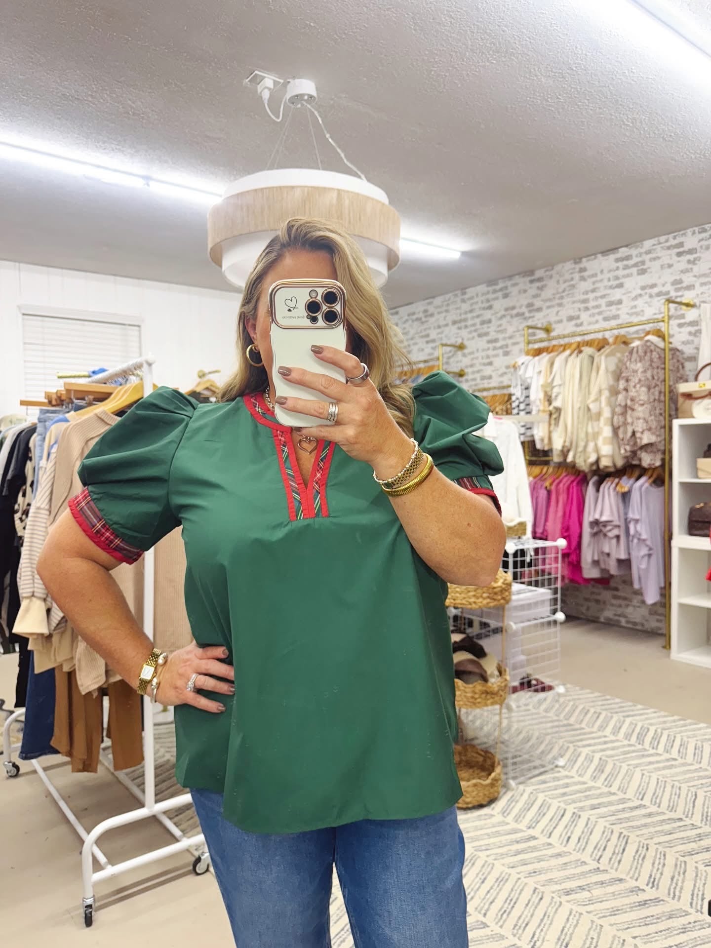 Get holiday ready in the cutest, most festive top of the season! This deep evergreen blouse features adorable red plaid trim along the neckline and sleeve cuffs, giving it the perfect touch of Christmas cheer. The puff sleeves add a flattering, feminine shape while the relaxed body keeps it comfy for all-day wear.