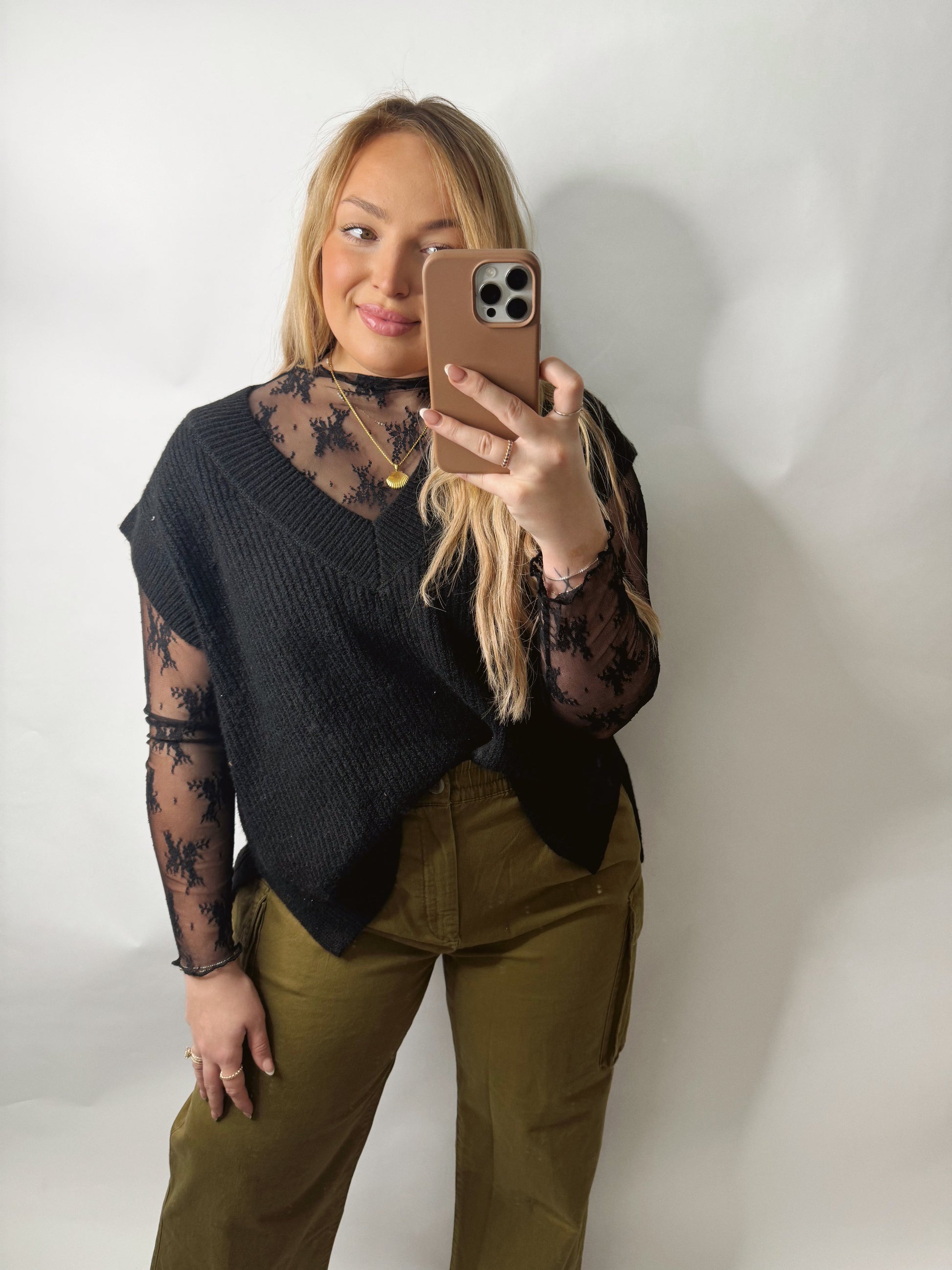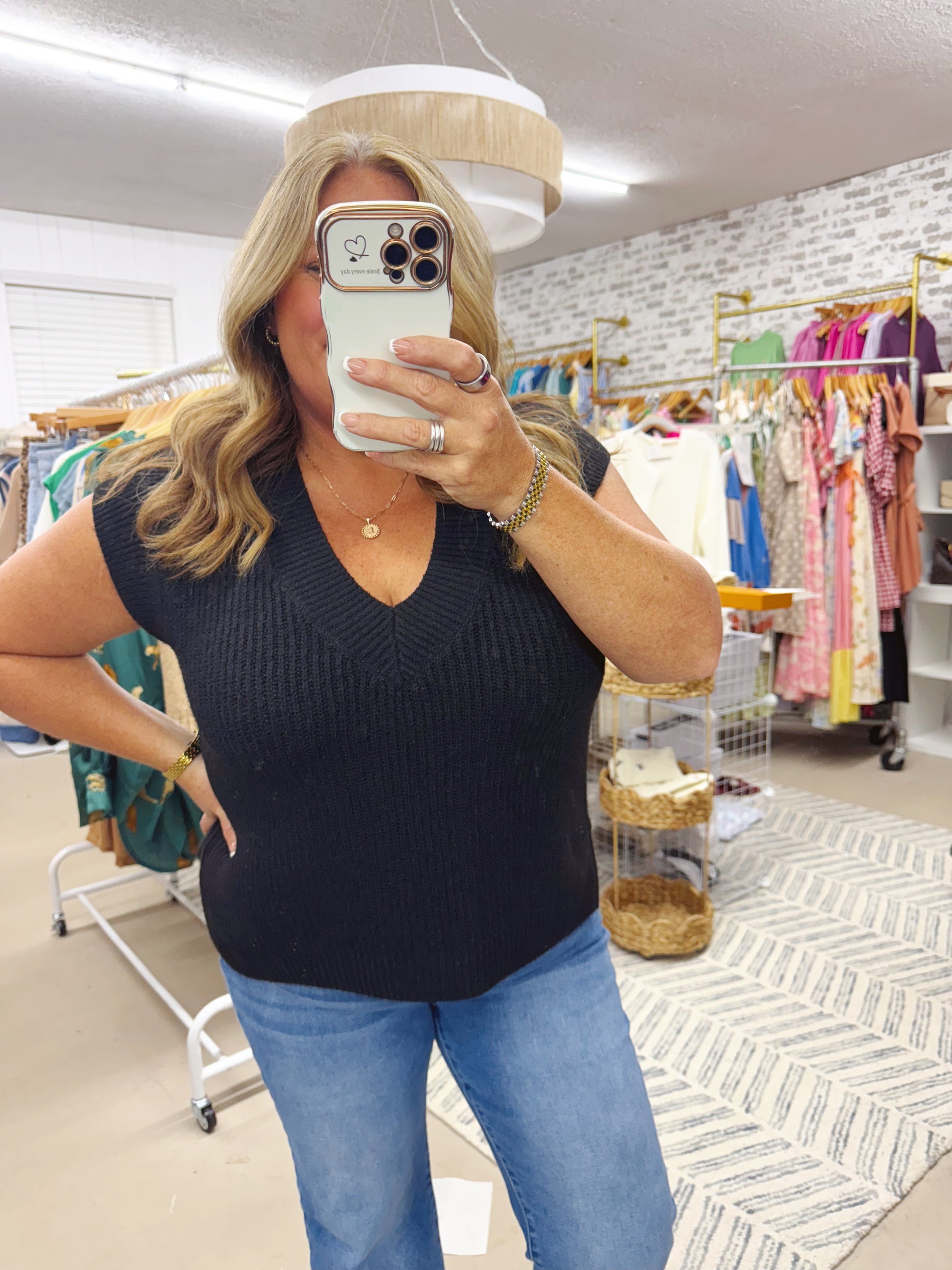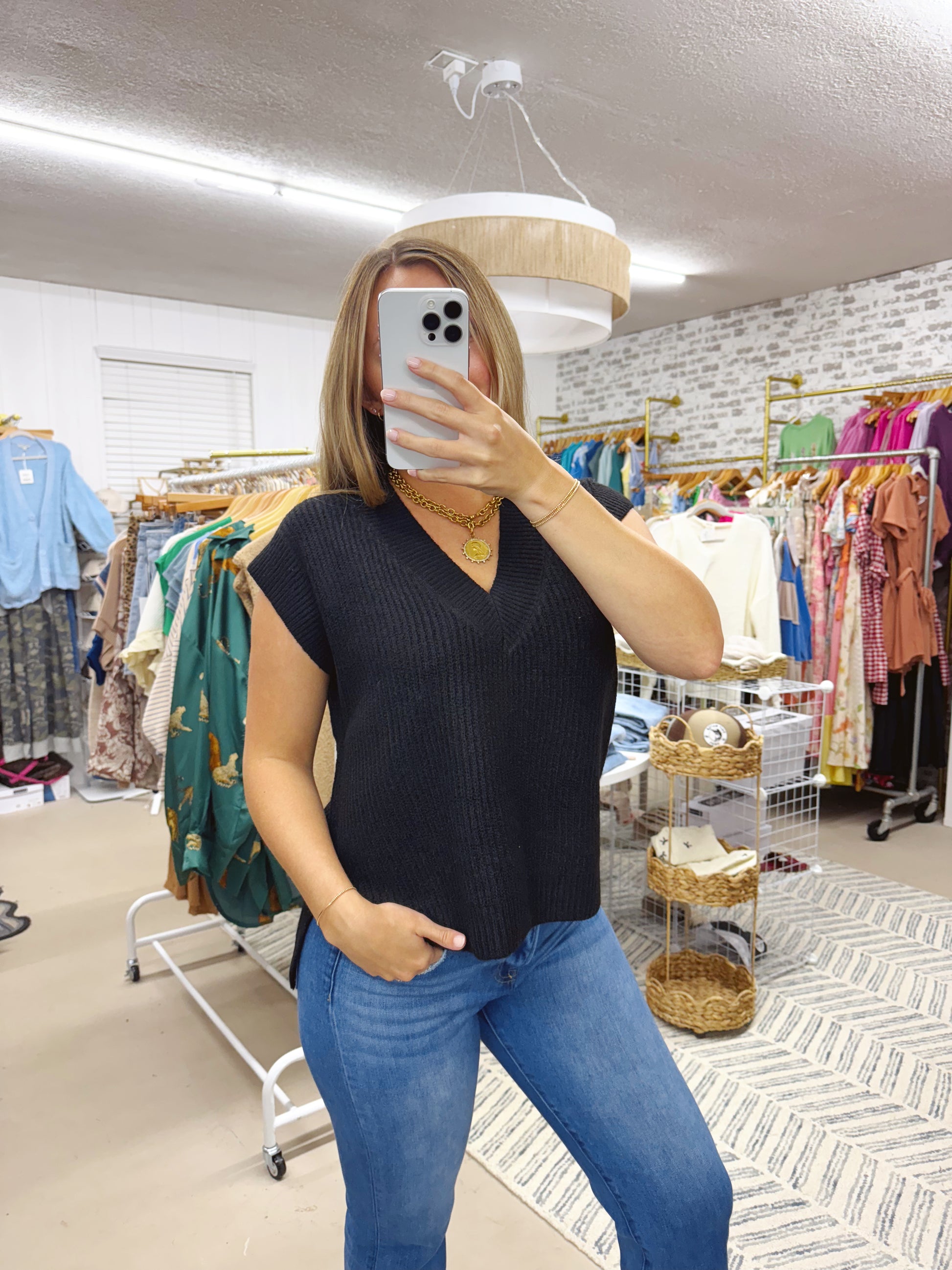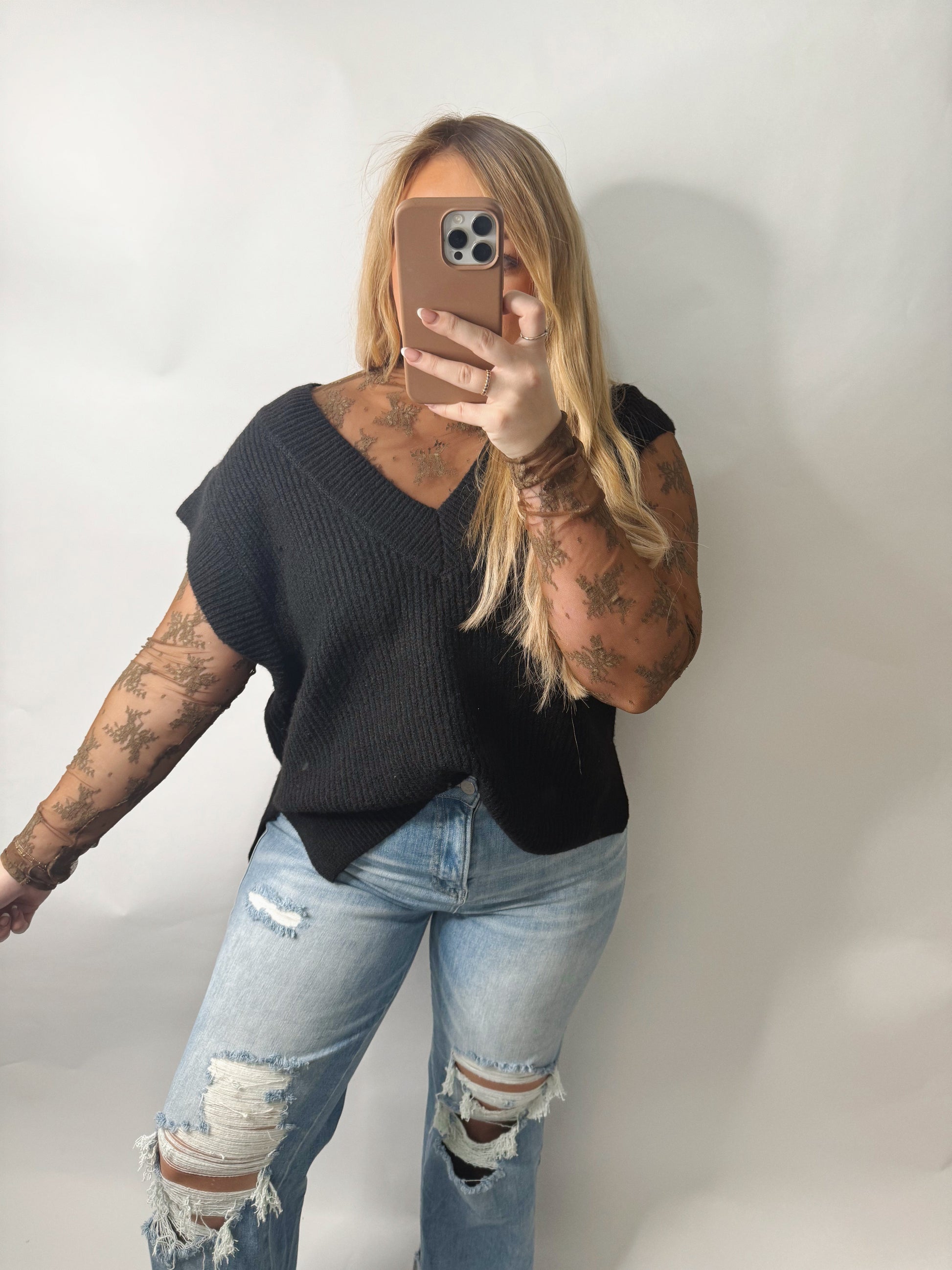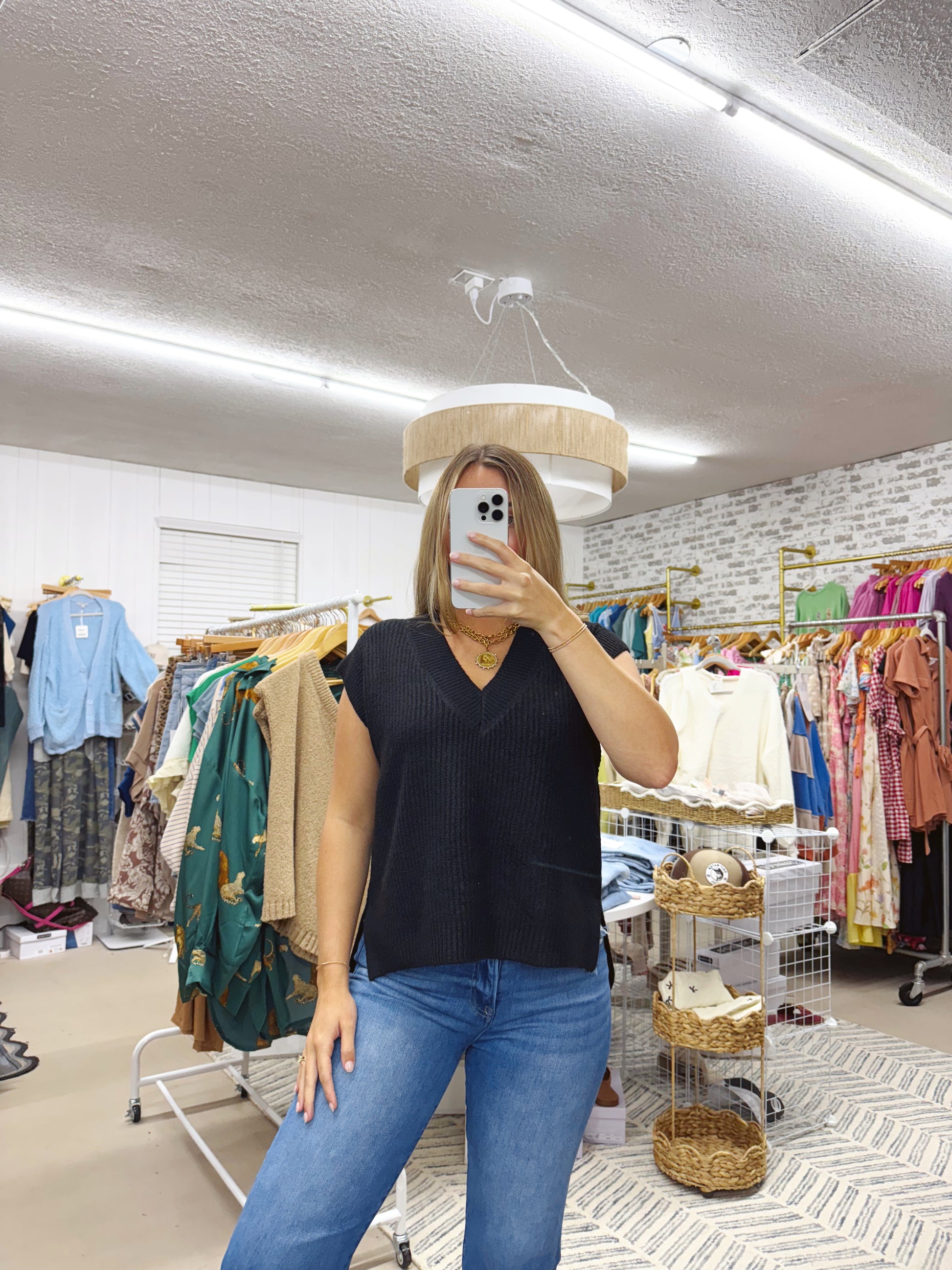 One of our best sellers! Elevate your basics with this versatile black knit sweater vest. Featuring a deep V-neckline, relaxed silhouette, and soft ribbed knit, it’s the ideal piece to style year-round. Wear it on its own for a sleek, minimalist vibe, or layer it over a lace top, blouse, or button-down for a chic, styled look. Loose fit.