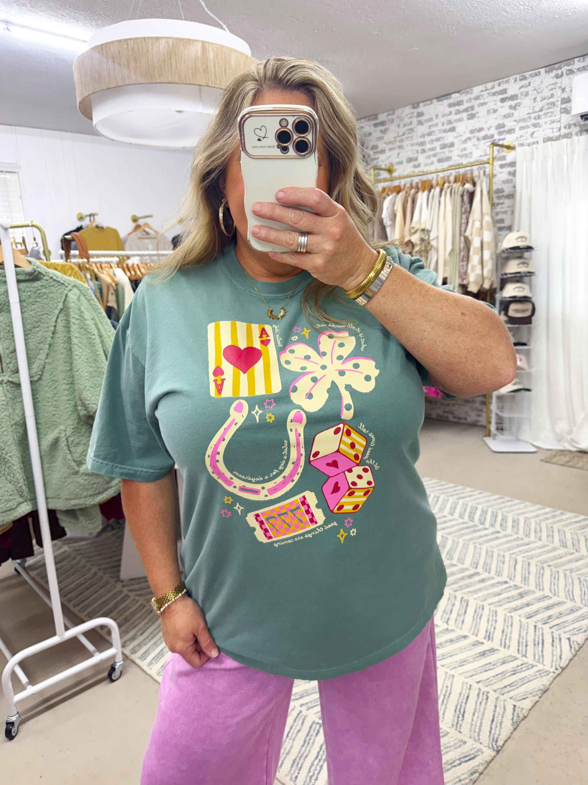 Fun, bold, and full of lucky charm š This graphic tee features playful lucky details in bright pops of color, perfect for adding a little personality to your everyday look. Comfort colors brand tee true to sizeĀ