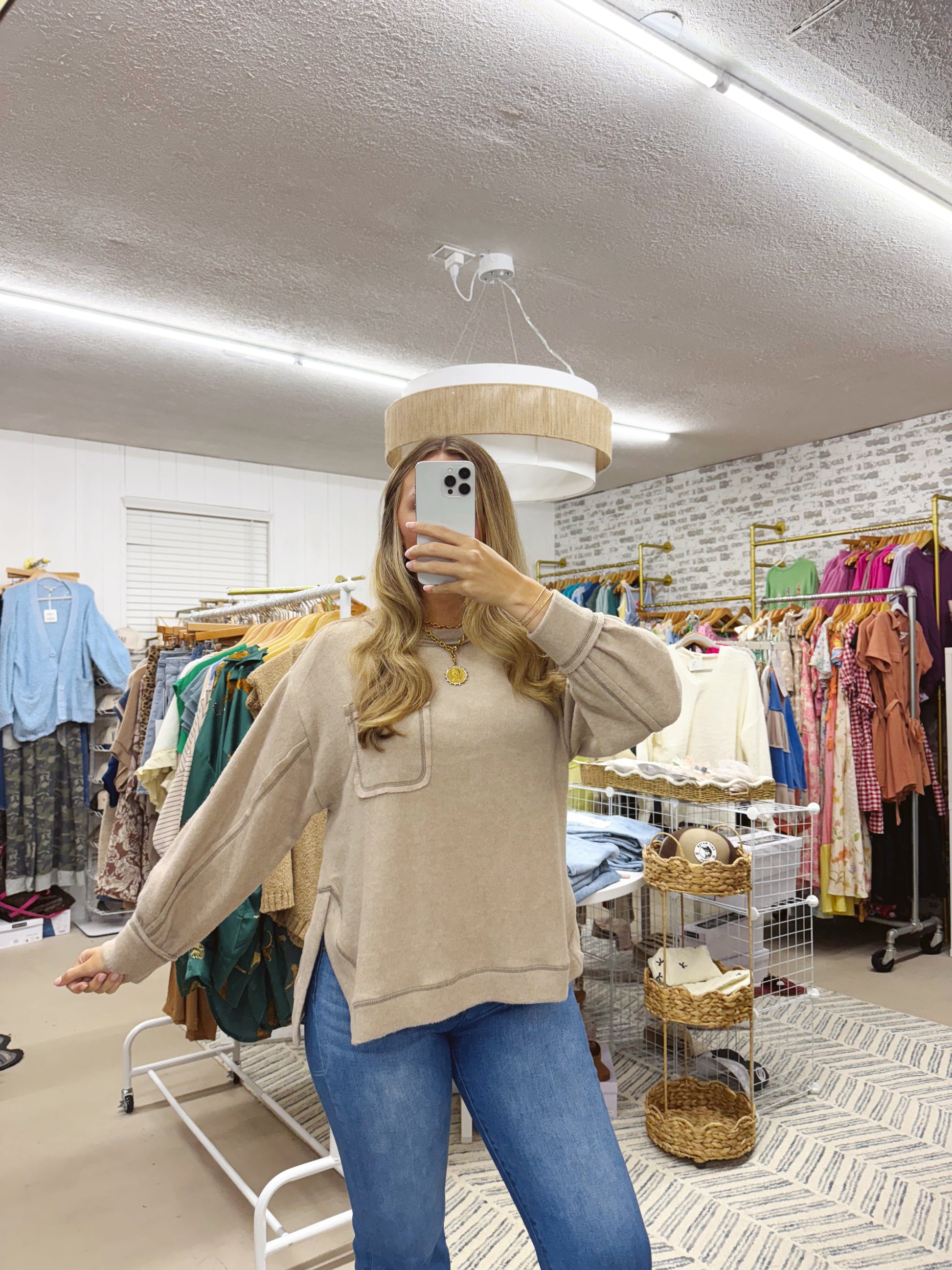 Extremely soft brushed hacci pullover with front pocket and side slits. Loose fit with lots of stretch.