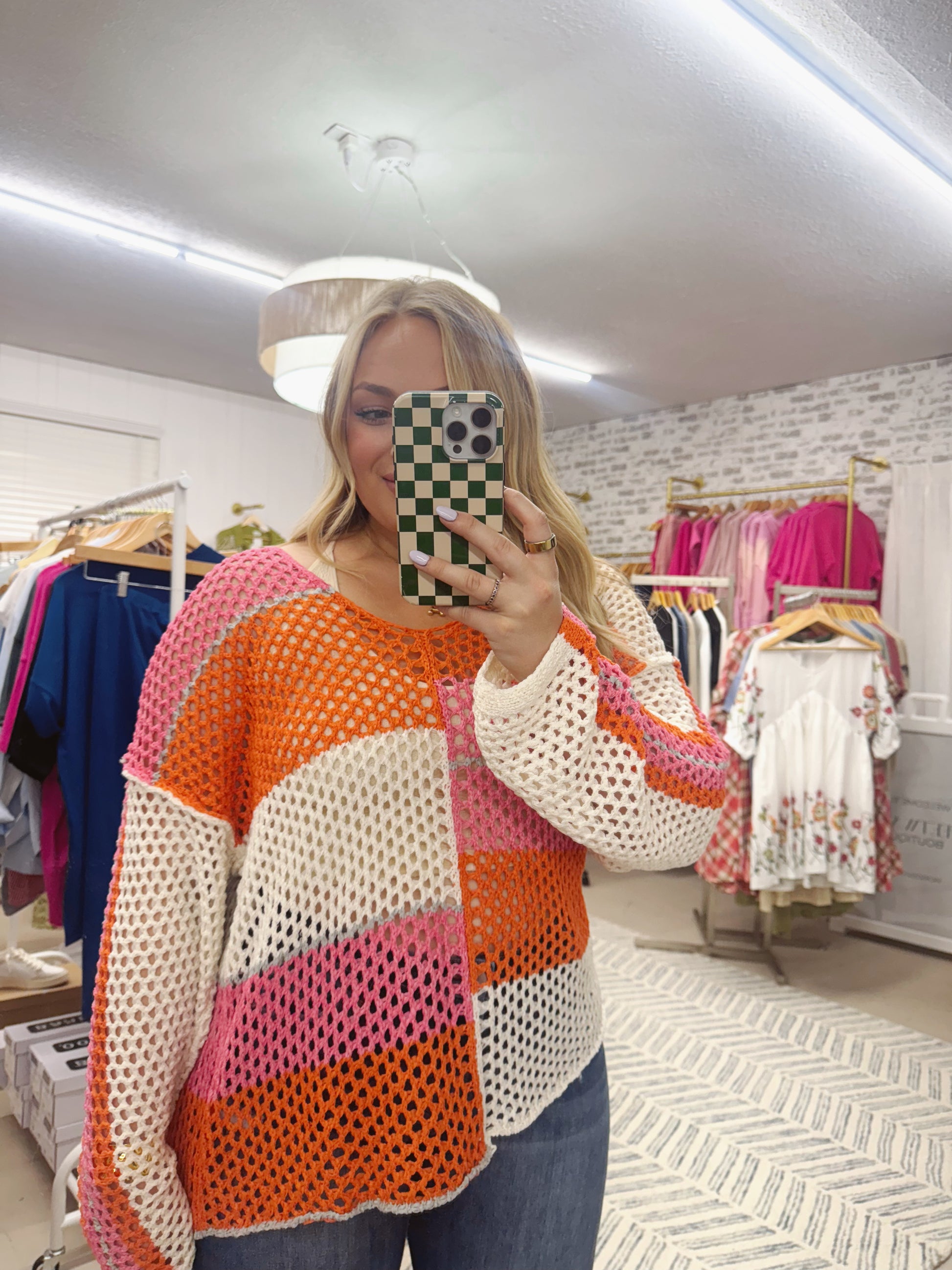 Color Block Oversized Summer Knit Sweater Top V-Neck - Drop Shoulder - Long Sleeve - Multi Pink/Orange Color.