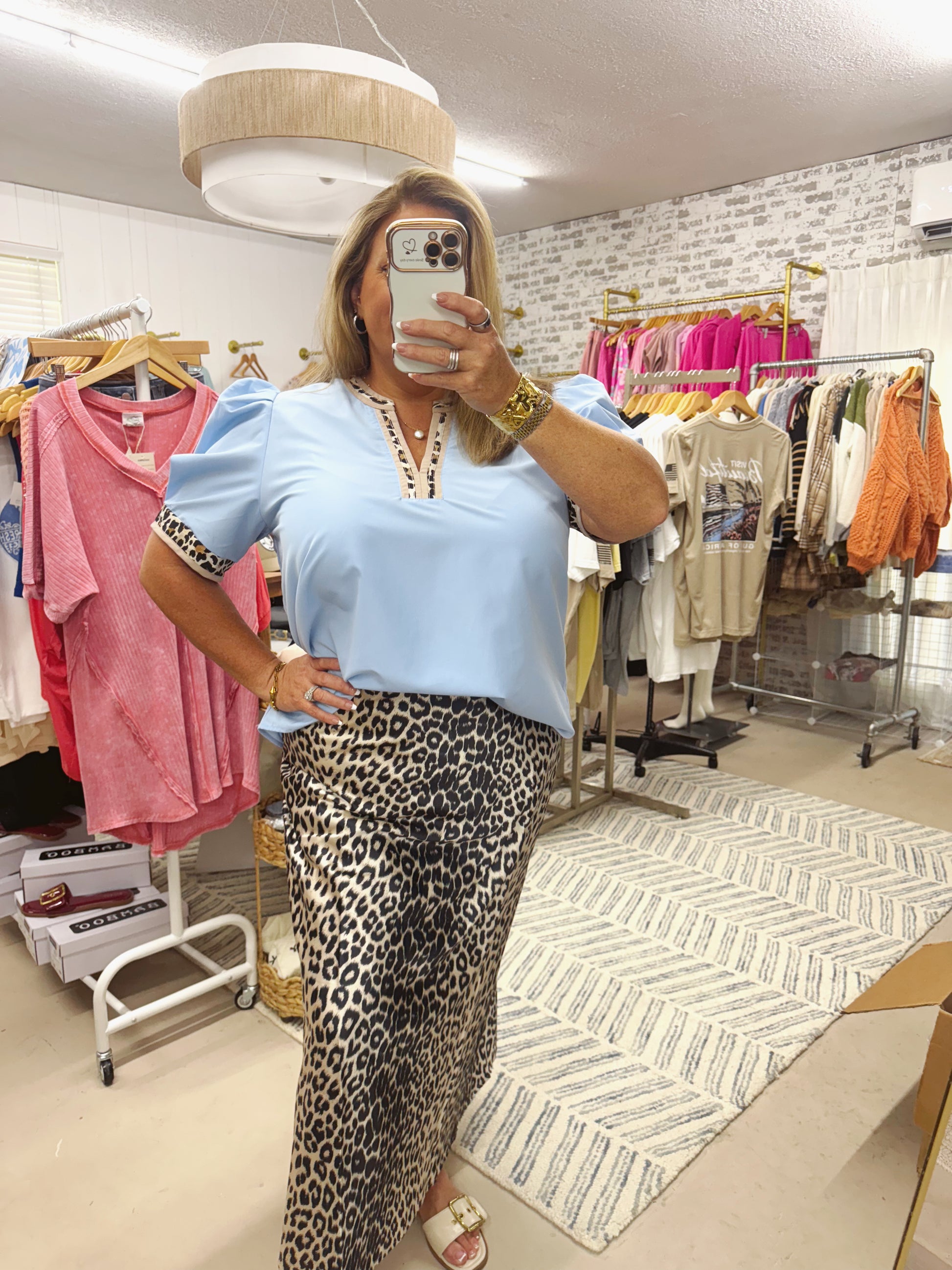 The Sky | Leopard Trim Light Blue V-Neck Top