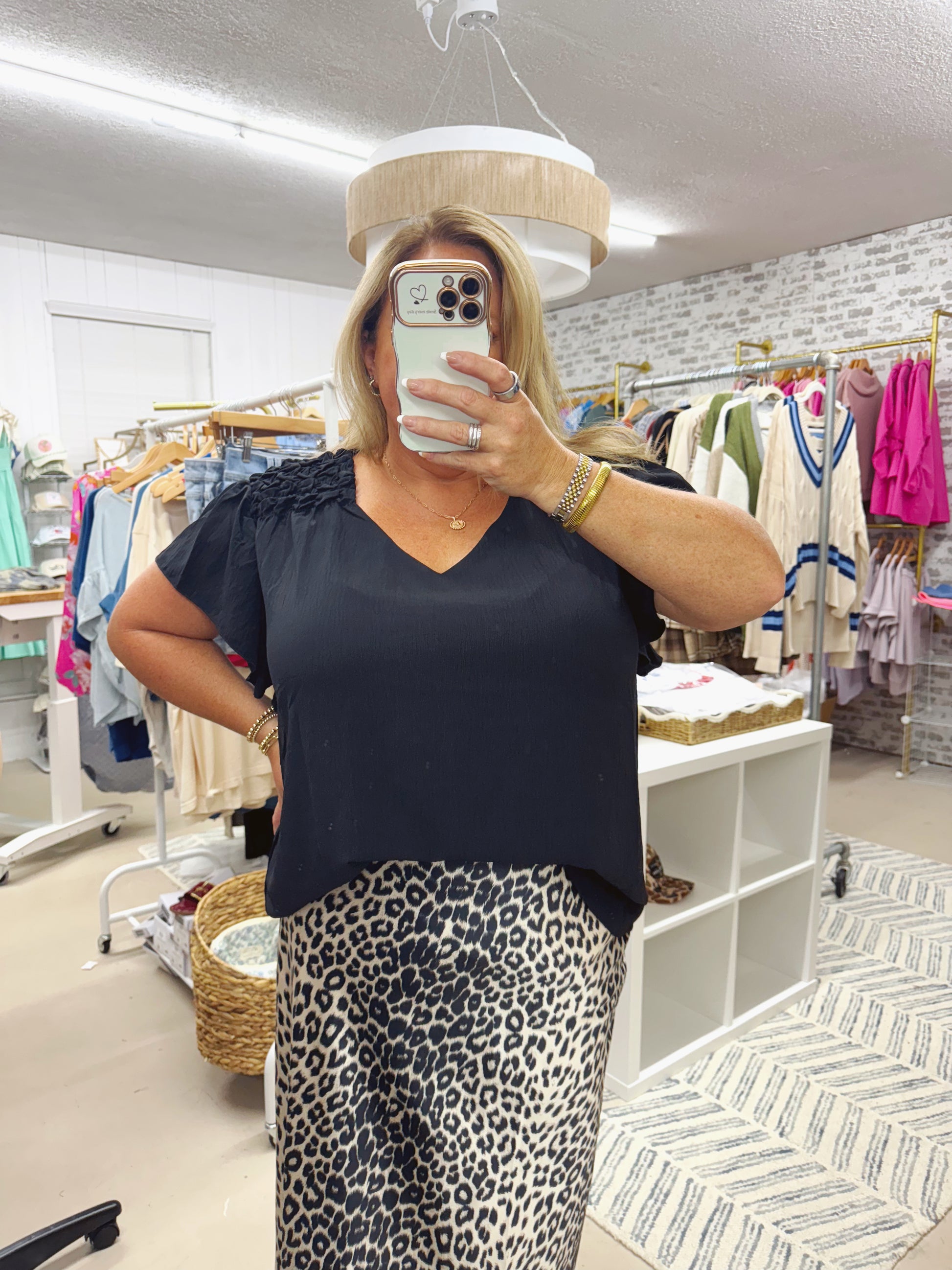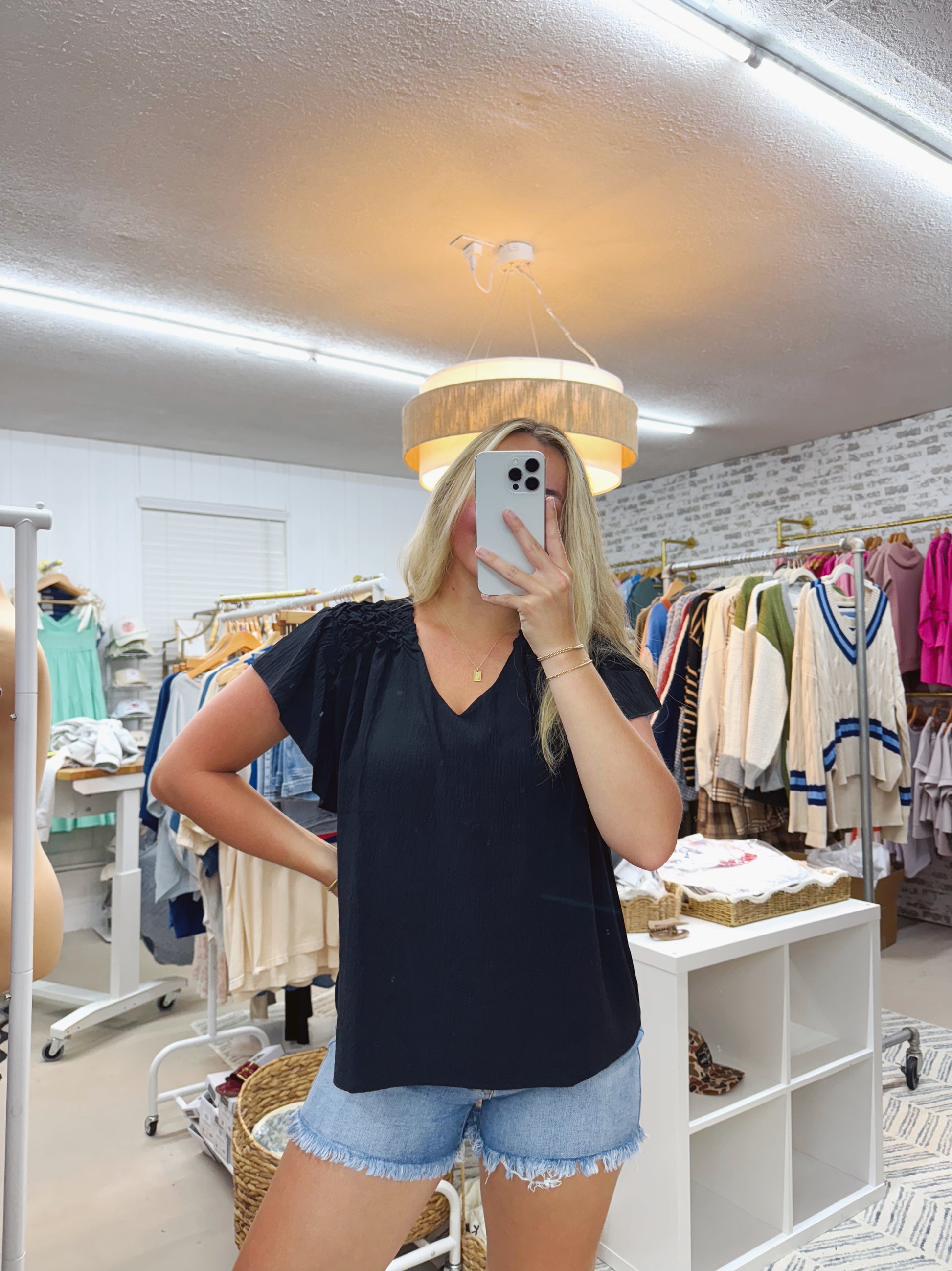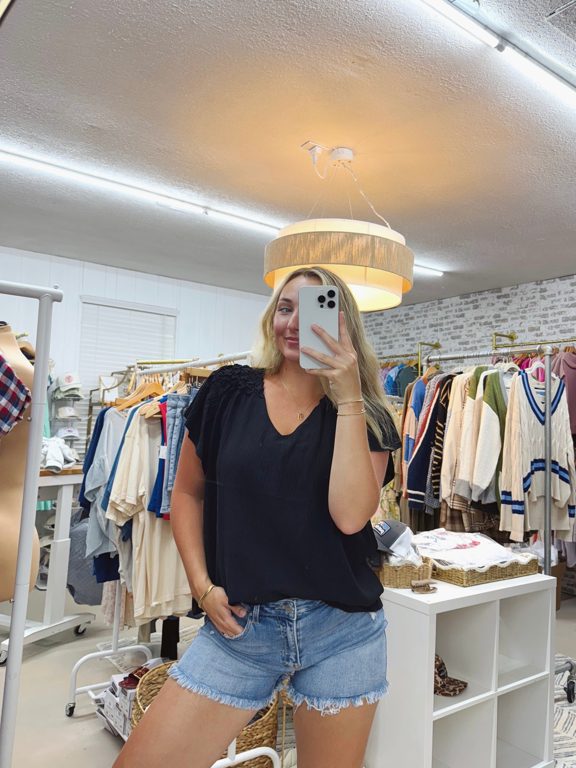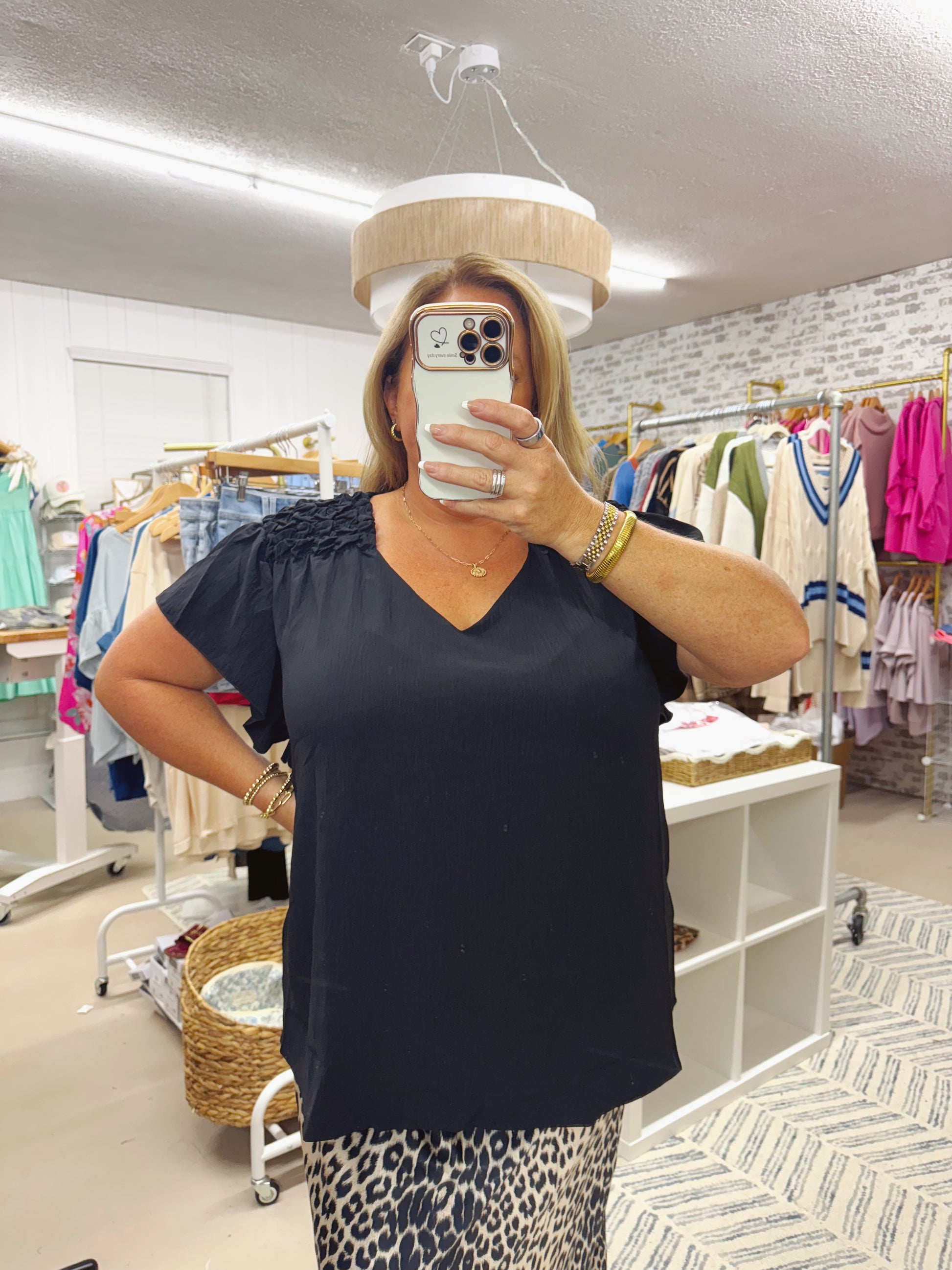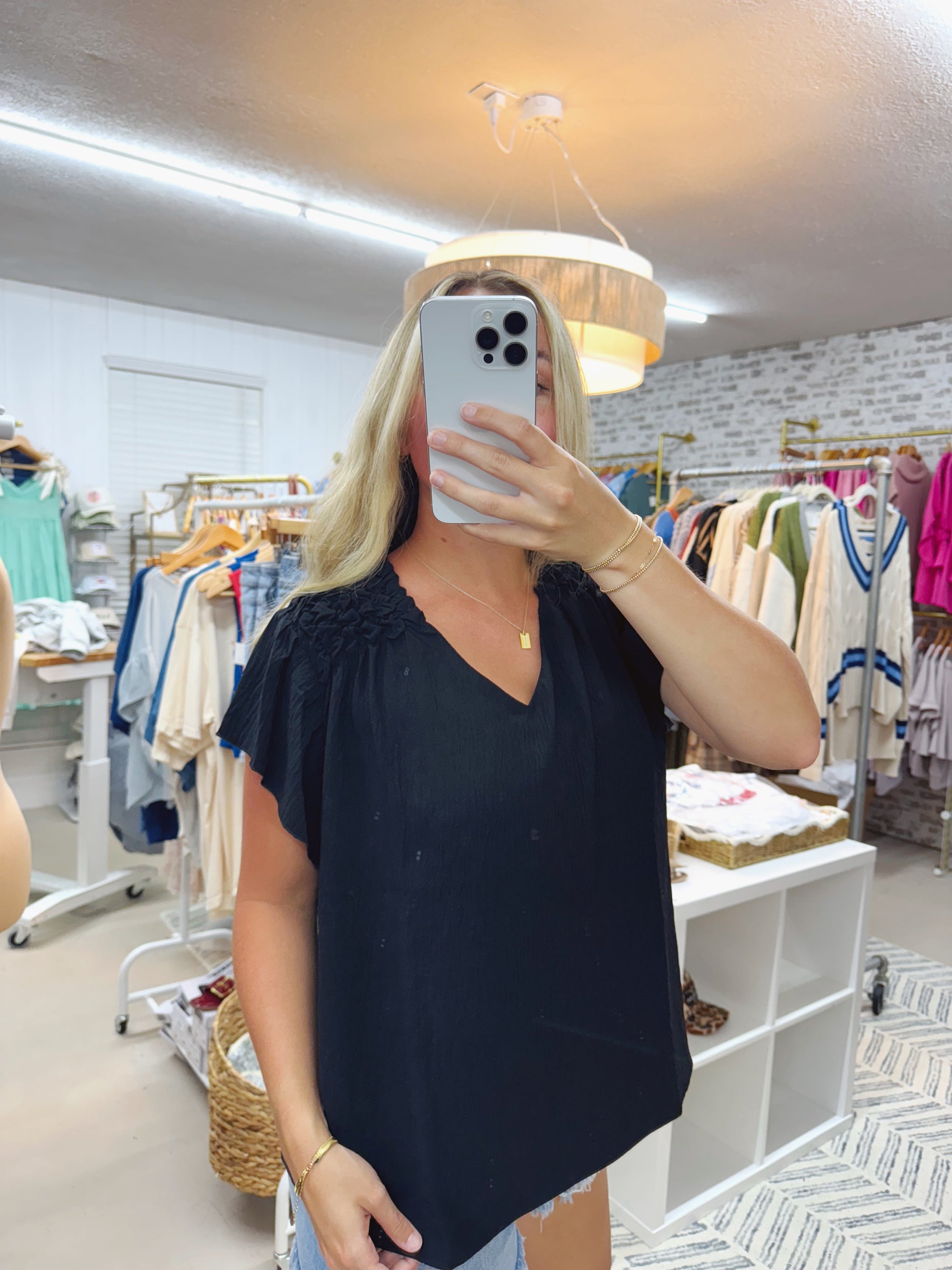 Solid woven blouse with shoulder smock detail and a ruffle short sleeve.