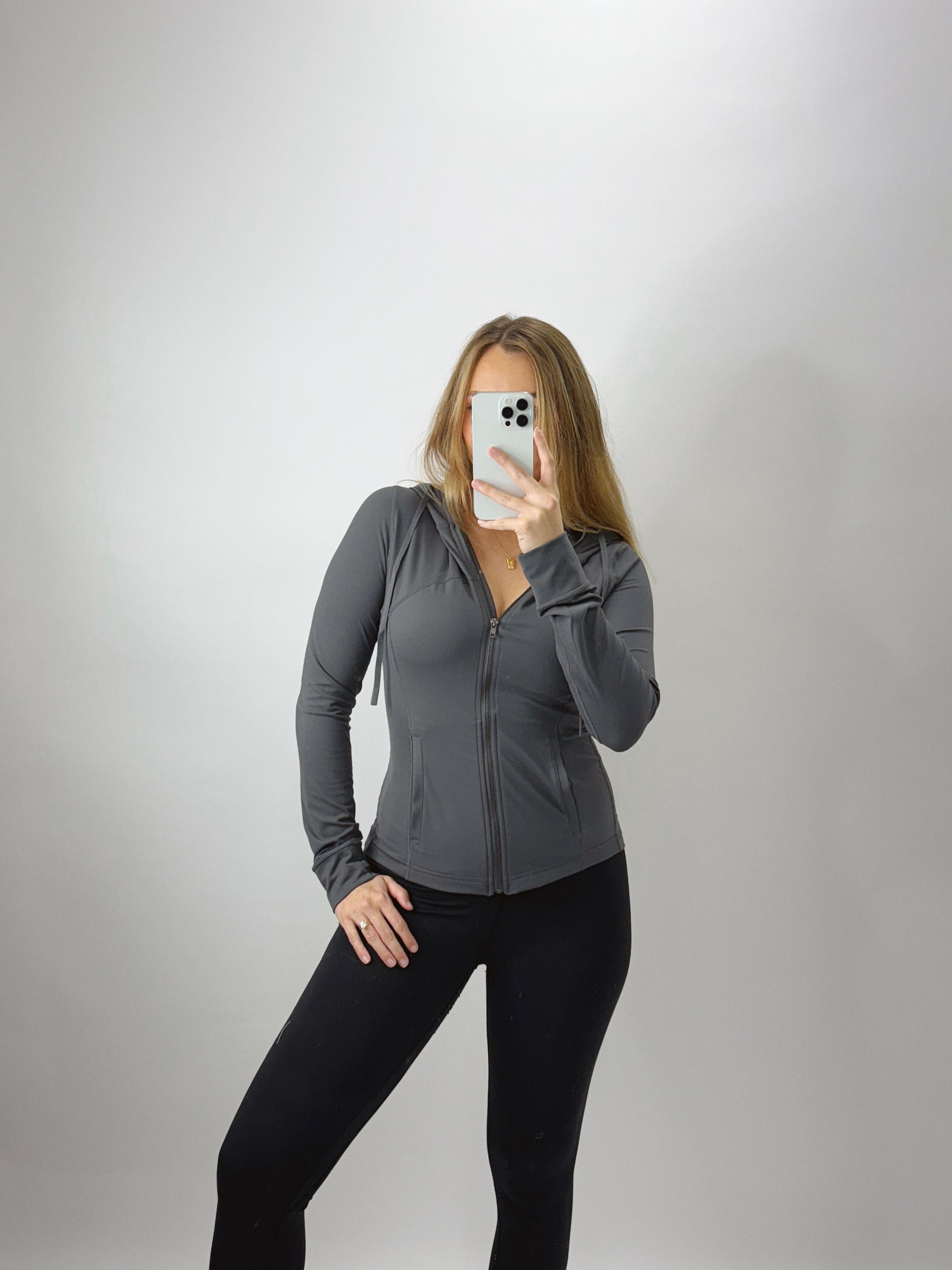 Solid knit performance fitted activewear jacket. Buttery soft, charcoal color. 80% Polyester, 18% Spandex.
