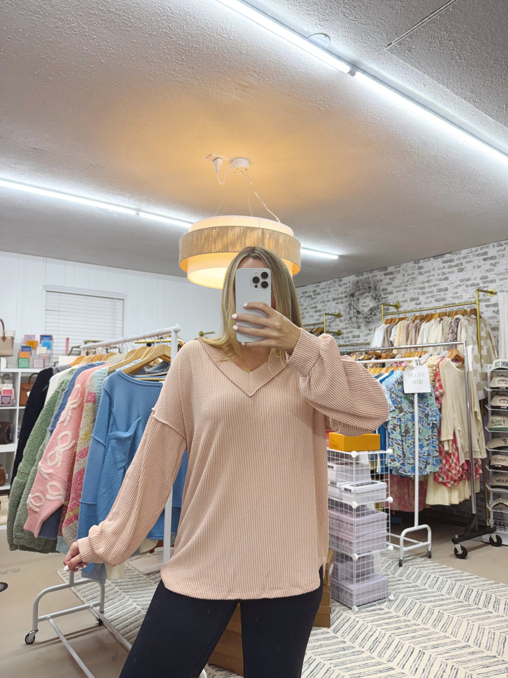 Soft, feminine, and effortlessly flattering — this ribbed long-sleeve is the easy throw-on top your closet needs. The lightweight ribbed knit adds texture without bulk, while the relaxed fit drapes so naturally. The soft V-neckline gives it that perfect touch of chic. True to size