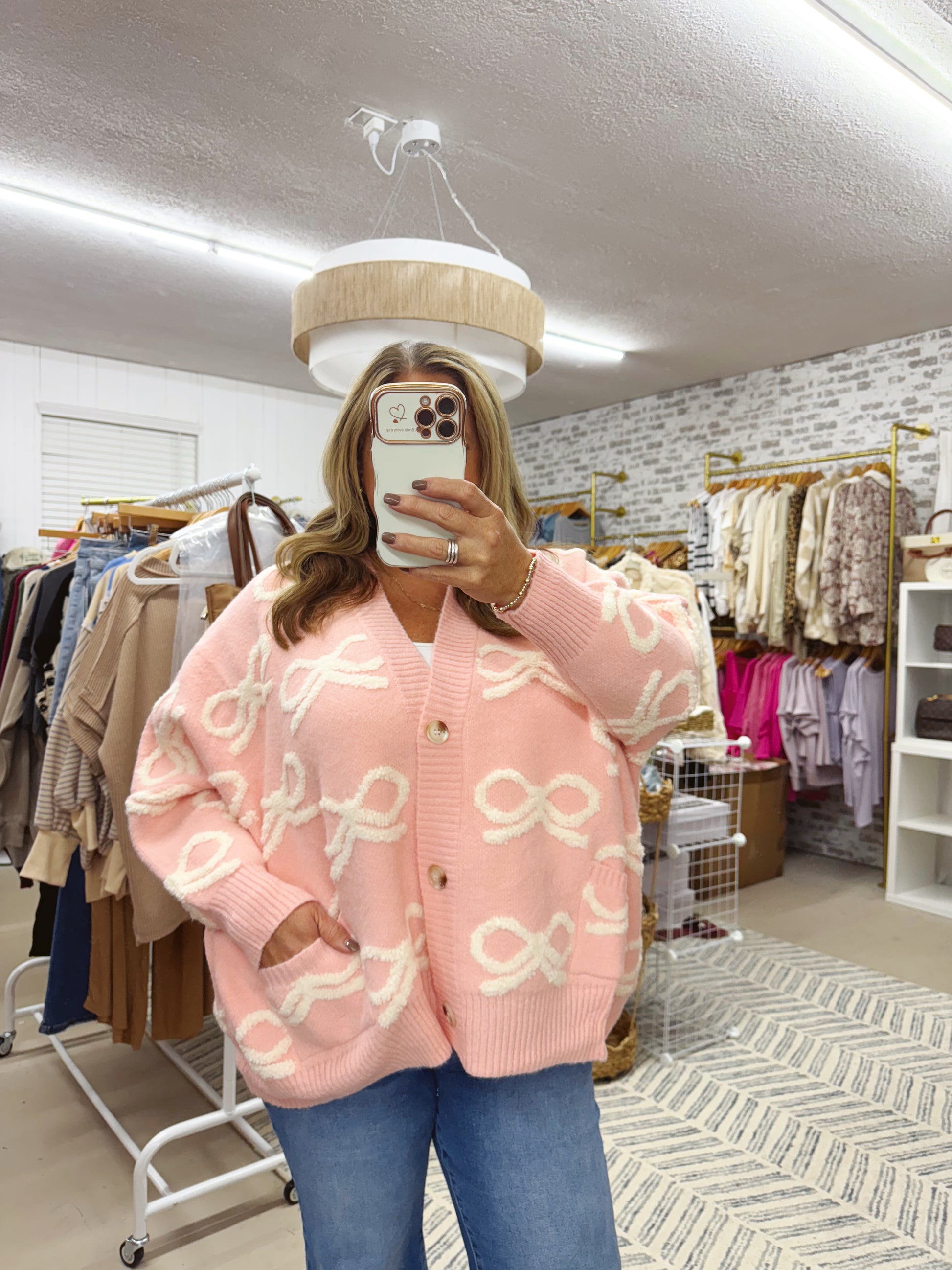 Sweet, soft, and so feminine — this baby pink cardigan is a total statement piece. The cozy knit is covered in cream textured bow detailing that gives it the cutest boutique look. Bucket List Brand. Very Oversized Fit